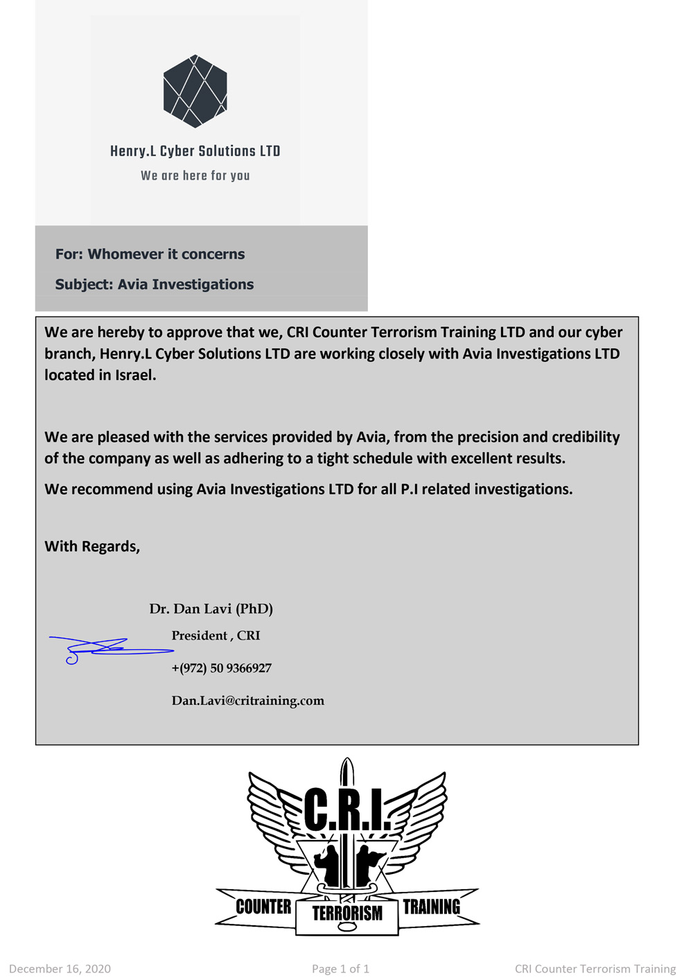 משרד "אביה חקירות וביטחון" פועל ברישיון משרד המשפטי משנת 1996.